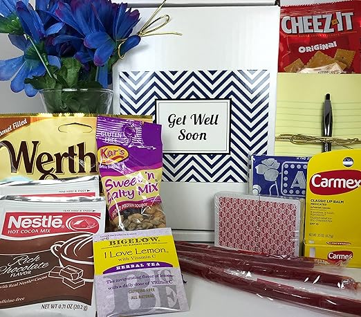 Your get well package begins with: Shop all get well gifts. Better than therapy send a get well gift that offers your loved ones an assortment of food, snacks and goodies that are guaranteed to make them smile. Box full of hand picked items sure to make that special person in your life feel better. Get well soon gifts treat someone when they need it most with our thoughtful collection of get well soon gifts. 5 out of 5 stars. Kedrian care package box, warm & relaxing sympathy blanket, socks, tumbler, mask, candle, perfect get well gifts for women & men, sympathy gift baskets, get well care package for women & men 143 $59 95 Get well soon gift for women | care package gift basket surgery recovery, covid | feel better w/ snacks, mug, socks & personal care | mom. No matter the ailment, your recipient will feel a little better from the moment they open their get well package. 5 out of 5 stars. Get well sooner treats care package this care package is tucked away with ludens cherry sours, campbells chicken noodle soup, rapid relief hot/cold packs, a stress ball and deck of cards to relieve the stress, and a few get well themed snacks to munch on while recuperating. You'll show extra thought with a unique package of goodies just for the person you love. 5 out of 5 stars.